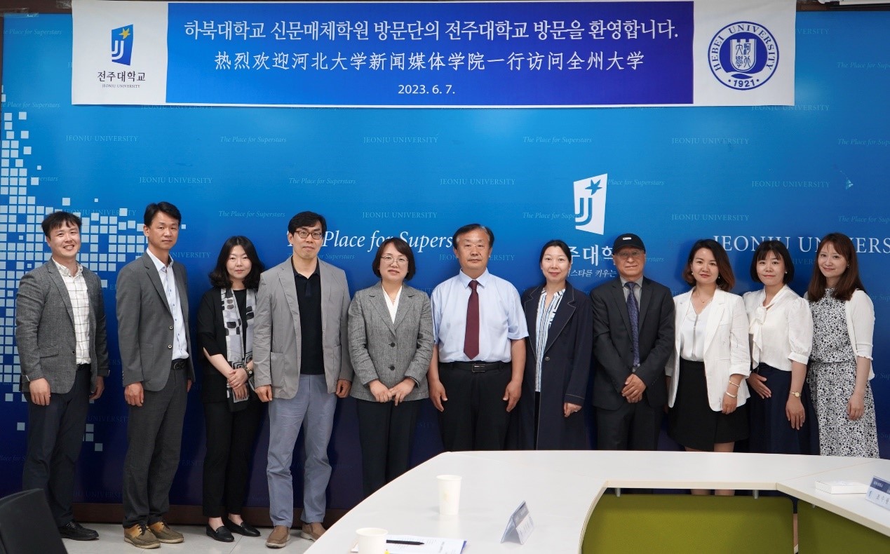 图1:我院代表团与韩国全州大学学术研讨会后合影。全州大学国际交流院院长诸慧琴、副院长金珍诚、金泳燮科长及电影电视系郑丞恩主任、韩丞龙教授等出席了座谈会。