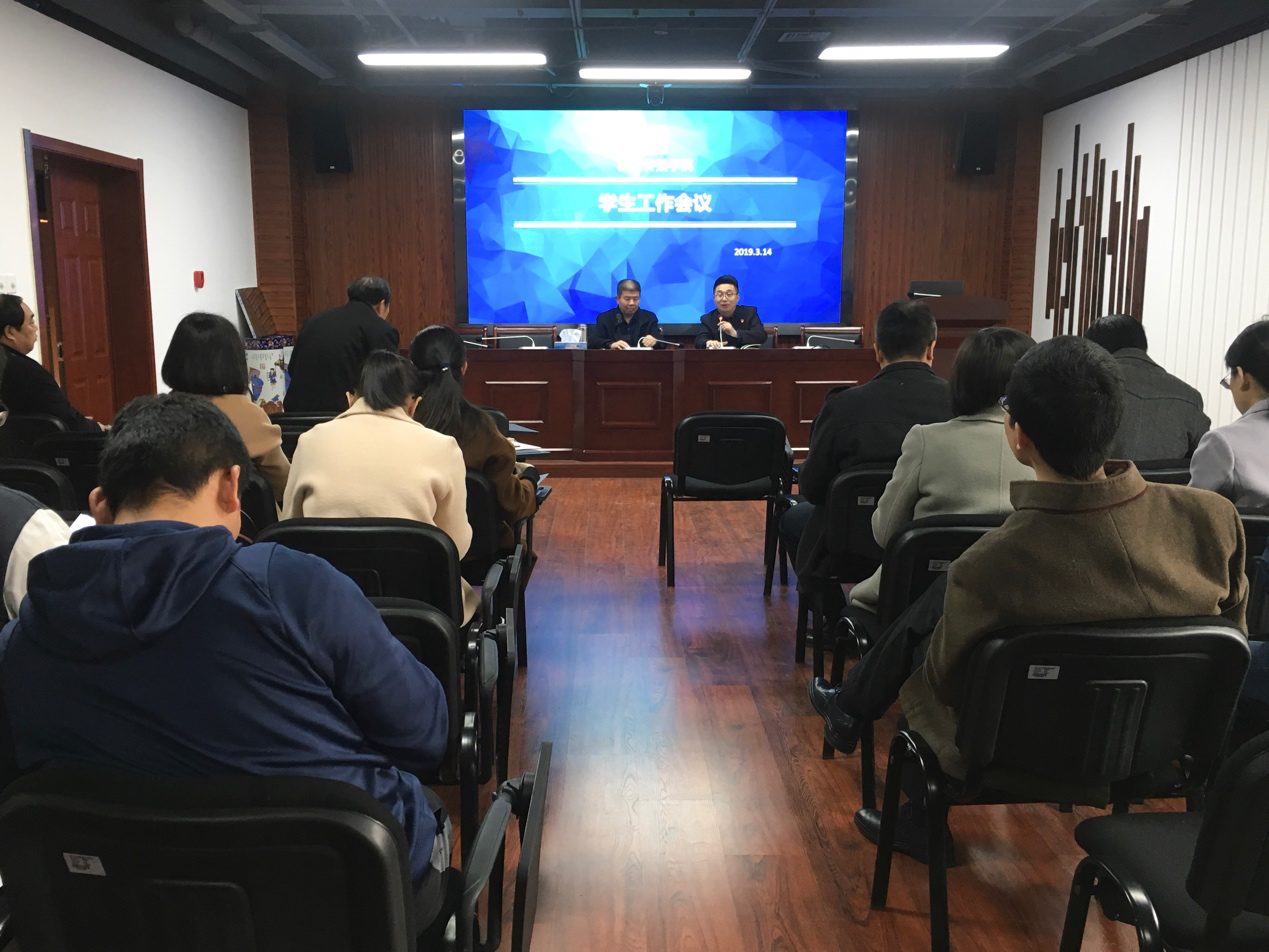 2019年3月14日,新闻传播学院召开2019年第一次学生工作会议,新闻传播学院党委书记王景明,党委副书记、副院长滑晓军,团委书记兼学工办主任徐兰英,专职辅导员蒋来水以及我院全体辅导员与会。