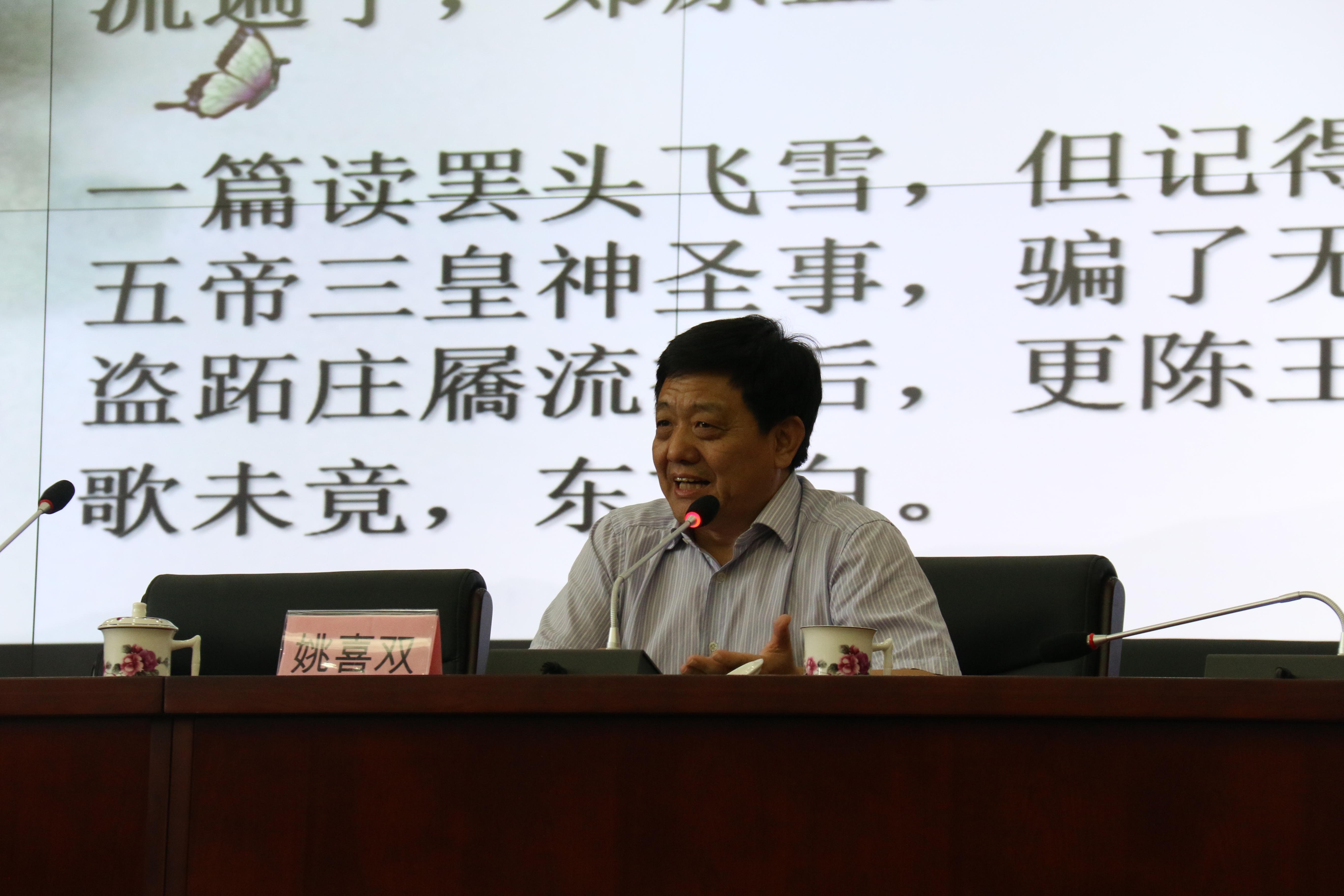 会议开始,姚喜双教授引用毛泽东著名诗词——《贺新郎·读史》开篇,向听众复述了毛泽东在读史作词时的精神状态以及他以诗言志的思想。诗词寥寥数句即向读者展示了从人类诞生到社会主义纵贯几百万年的历史,足以彰显诗歌的魅力所在。因此,姚教授倡导师生们多读诗、多朗诵,从而净化灵魂,陶冶情操,提高写作能力。