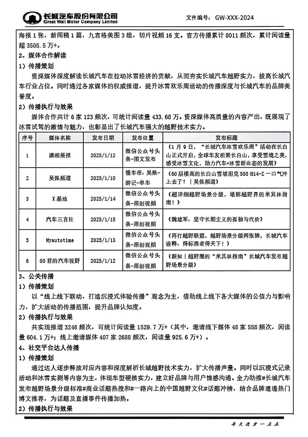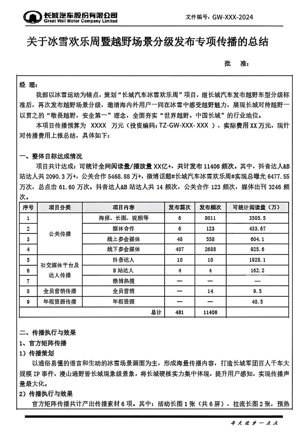 本作品内容为“长城汽车冰雪欢乐周暨越野场景分级发布专项传播”的内部总结,主要用于向高层领导汇报该传播项目的传播目标达成效果及费用使用情况。本人承担本作品的数据核对和撰稿工作,根据各部门各环节传播情况完成整体项目的总结工作。