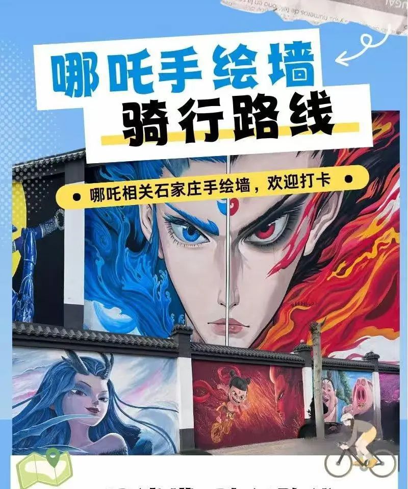 作品介绍:作品是对热门IP哪吒在石家庄的特色主题墙绘景点进行整理并设计打卡路线图整合为图文海报形式的H5作品,作品中还结合了骑行的元素,增强了内容的逻辑和吸引力。