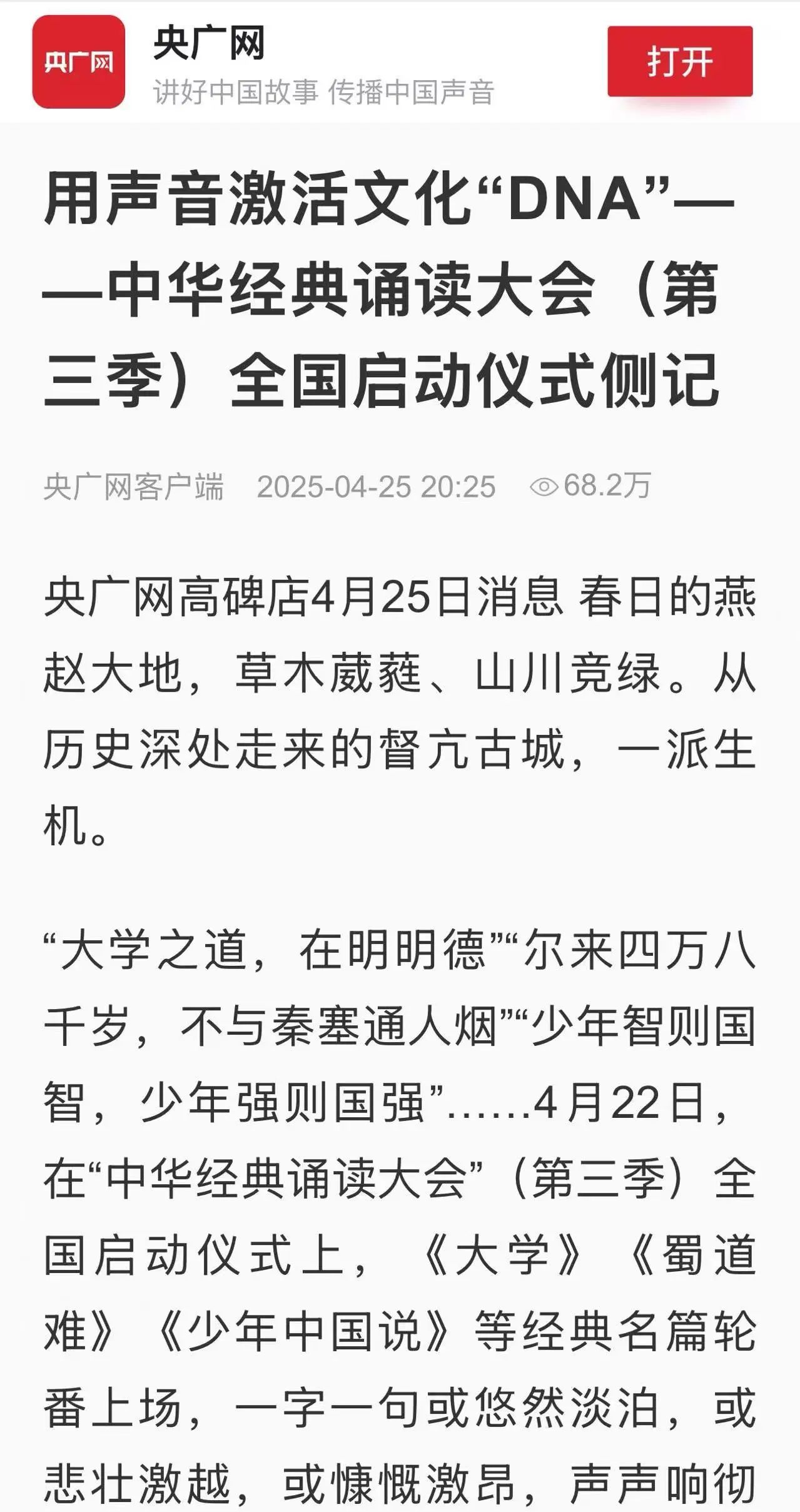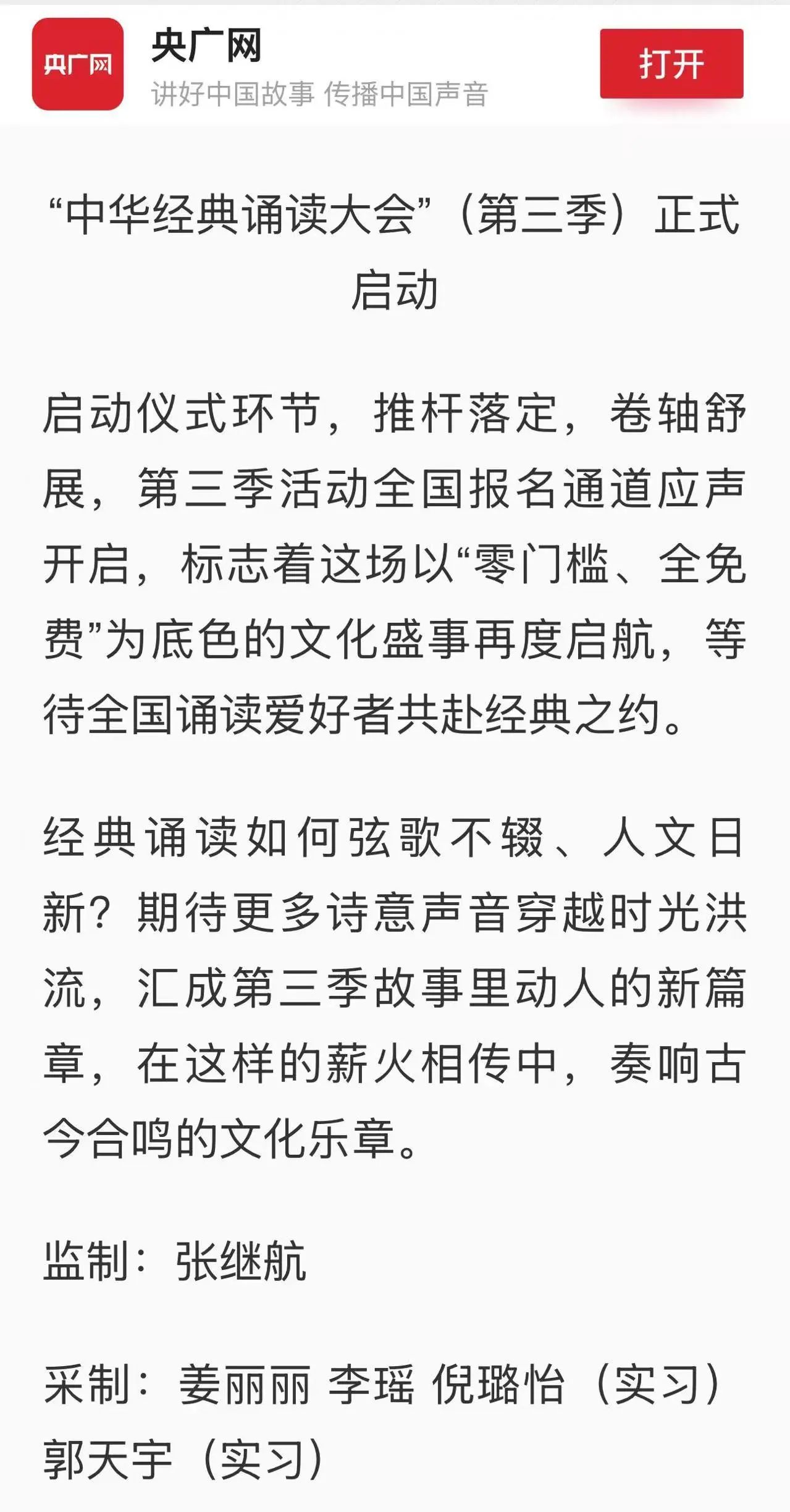 作品介绍:作品是中华经典诵读大会(第三季)全国启动仪式的相关报道,活动中来自多个领域的嘉宾齐聚一堂,以经典为桨,以声音为帆,用古韵新声演绎中华经典,点燃文脉赓续与经典诵读的热潮。当日活动直播在央广网App、抖音、快手、视频号,以及史视频、云听、央视网、国际在线等媒体平台精彩呈现,多角度多栏目关注报道,启动仪式相关话题总阅读量超5000万。